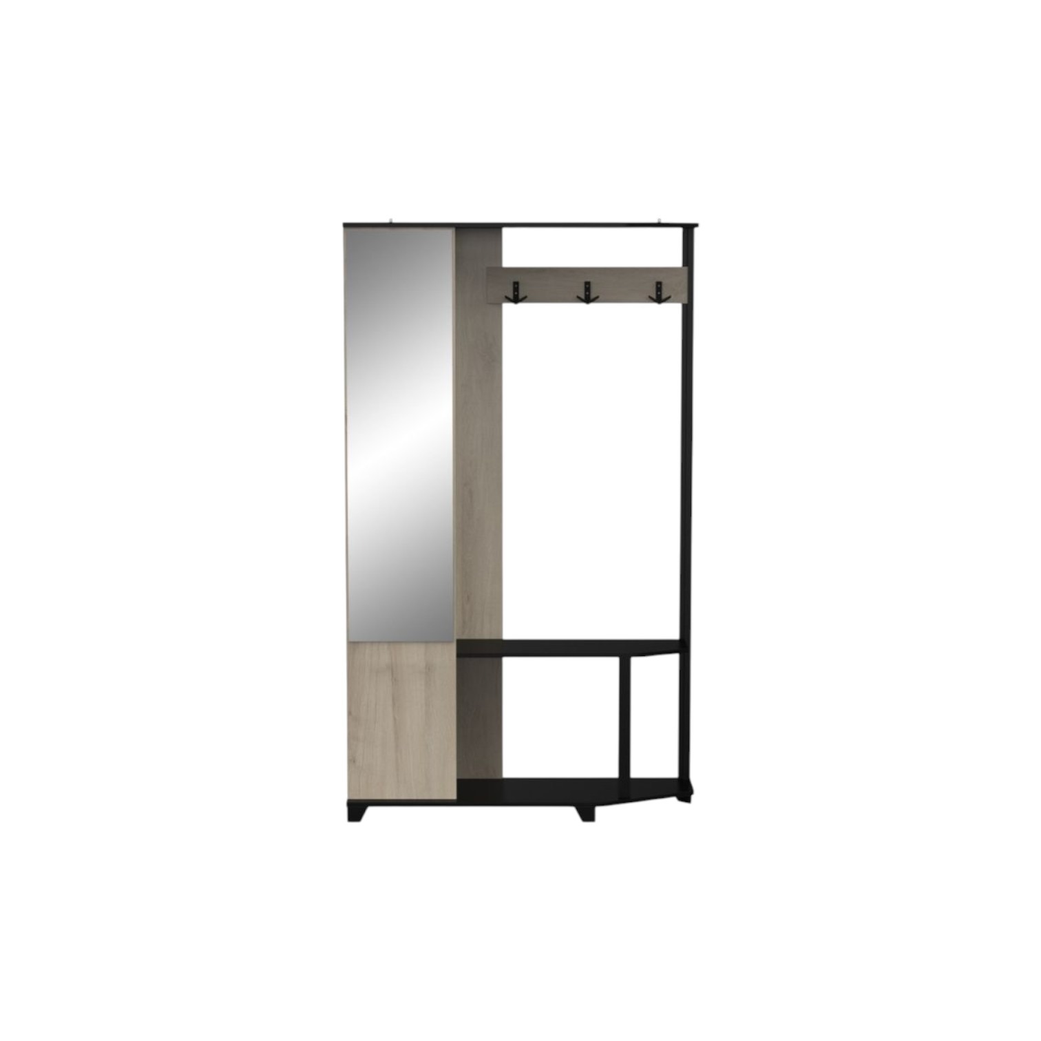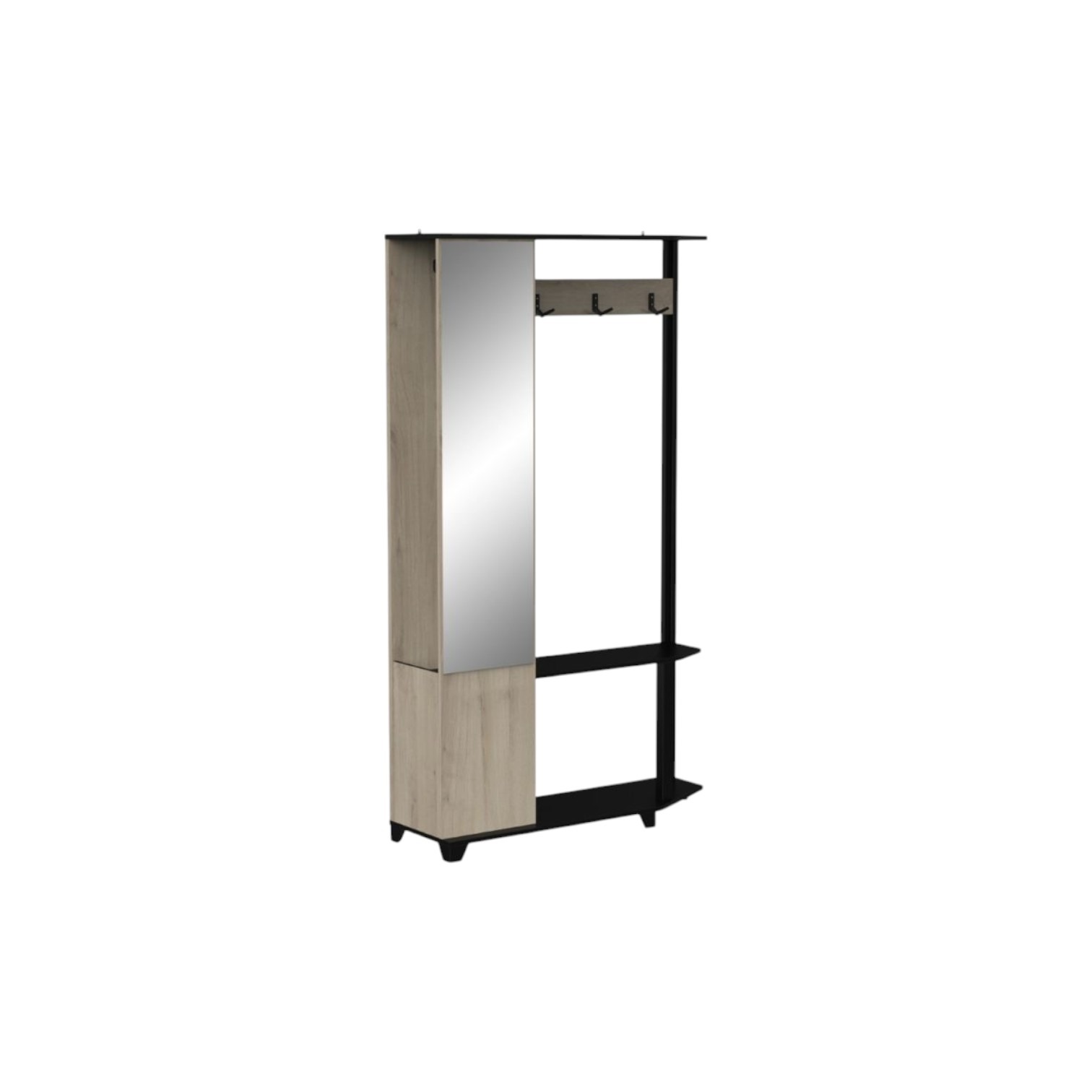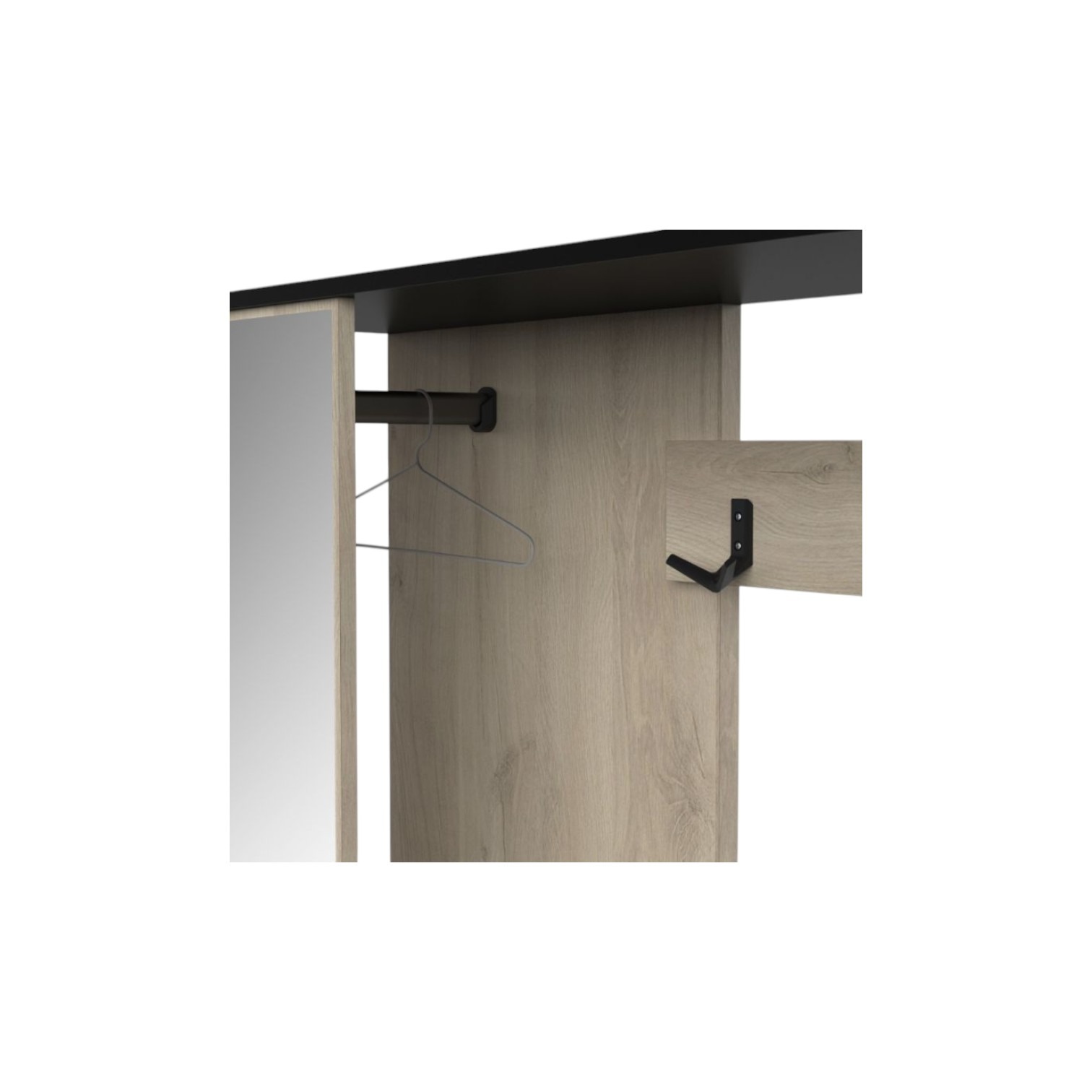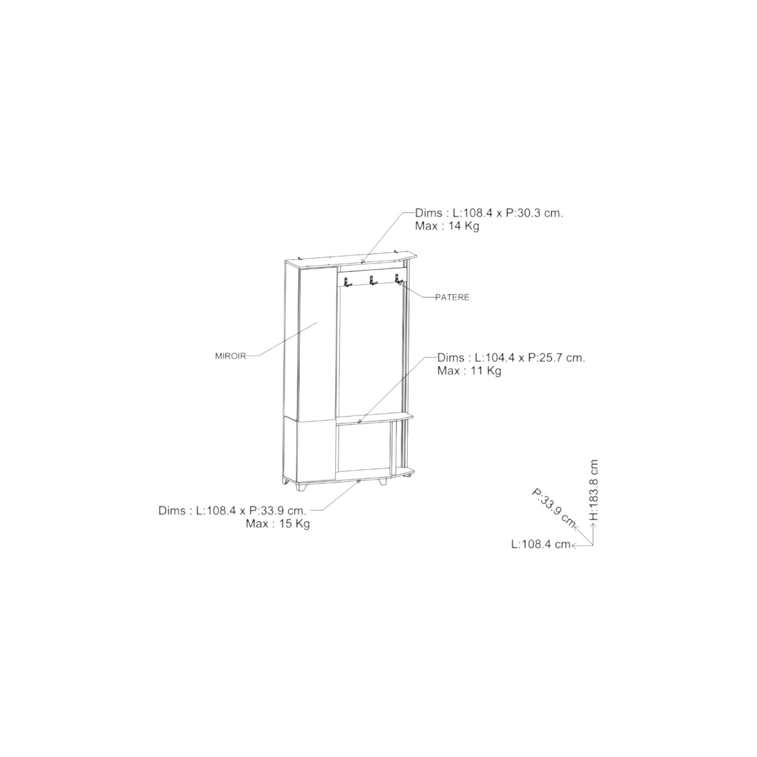 Predsoblje sa ugradbenim ogledalom, francuske proizvodnje. Izrađuje se od iverala debljine 1,5 i 2,2 cm, presvučeno melamin papirom u imitaciji Kronberg hrasta i obojan u crno. Opremljeno je s tri plastične kuke i jednom šipkom za vješanje postavljenom iza ogledala i dvije police. Ogledalo je dimenzija 125,5×32 cm i ima zaobljene rubove. Donja polica, odmah iznad poda, može držati do 15 kg, a gornja polica, u visini koljena, može držati do 11 kg. Gornja ploča vješalice može izdržati do 14 kg. Za dobru stabilnost, hodnik je potrebno dodatno pričvrstiti na zid priloženim elementima za pričvršćivanje.
