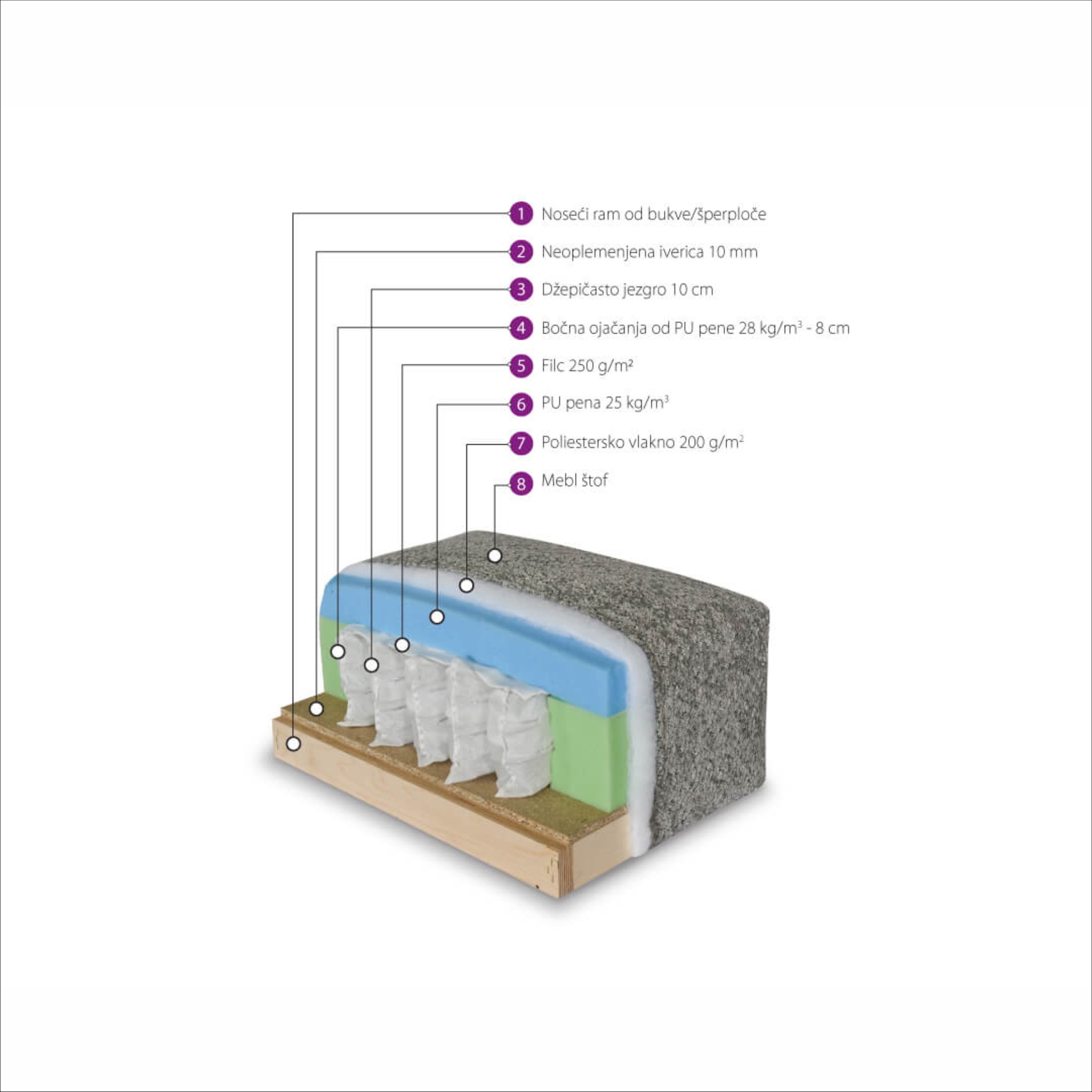 Kupnjom ovog komada namještaja ne dobivate samo udobnost, već i vrhunsku izradu koja osigurava da njegov izgled i udobnost izdrže test vremena. Kvaliteta se postiže pažljivom izradom svakog detalja – od čvrstoće okvira, preko preciznog šivanja, do izdržljivih jastuka koji zadržavaju oblik čak i nakon dugotrajne upotrebe. U kutnoj garnituri Noel, džepićasta jezgra visine 10 cm ugrađena je u dijelove sjedala i cijelu površinu za spavanje, što doprinosi maksimalnoj udobnosti i optimalnoj potpori tijela. Zahvaljujući tome, garnitura ne samo da omogućuje potpuno opuštanje, već i potiče zajedničke trenutke te stvara idealno okruženje za druženje.